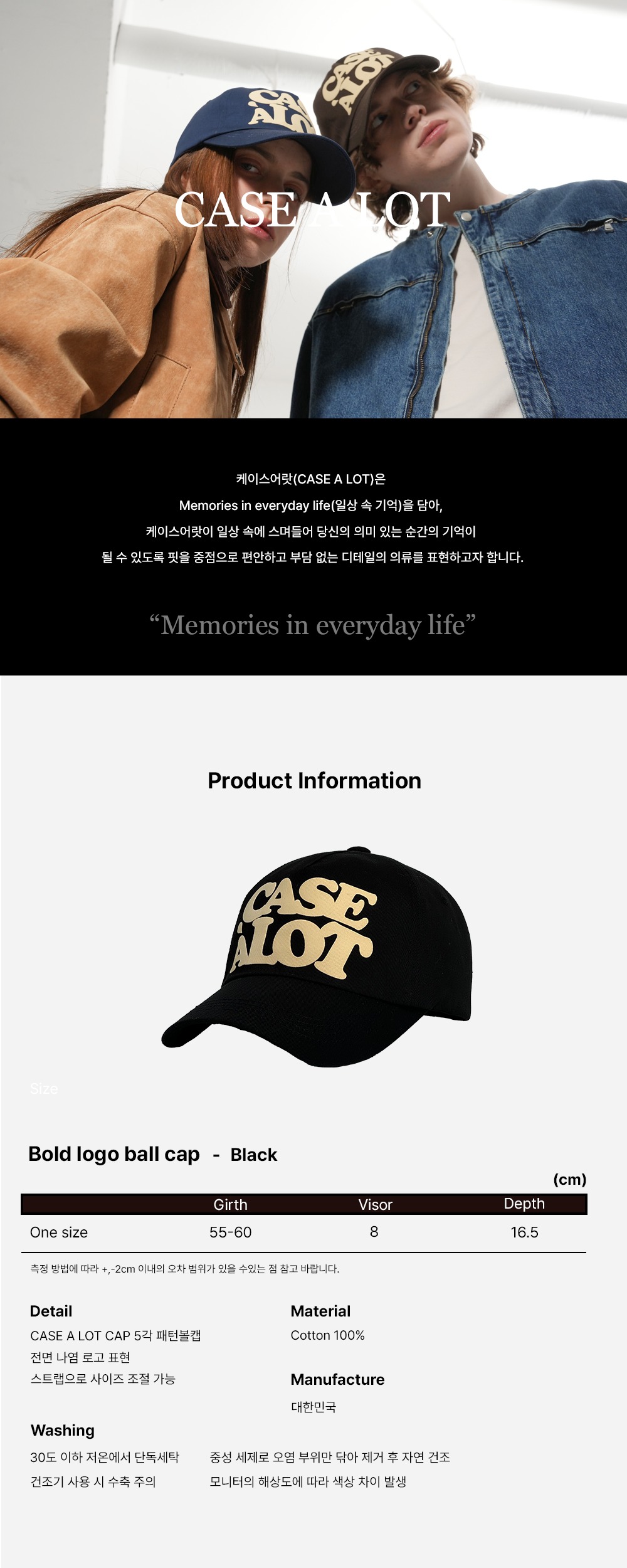 *CASE A LOT CAP 5각 패턴볼캡 전면 나염 로고 표현 스트랩으로 사이즈 조절 가능 *Washing 30도 이하 저온에서 단독세탁 중성세제로 오염 부위만 닦아 제거 후 자연건조 건조기 사용 시 수축 주의 모니터의 해상도에 따라 색상 차이 발생 *측정 방법에 따라 +,- 2cm 이내의 오차 범위가 있을 수 있는 점 참고 바랍니다. |