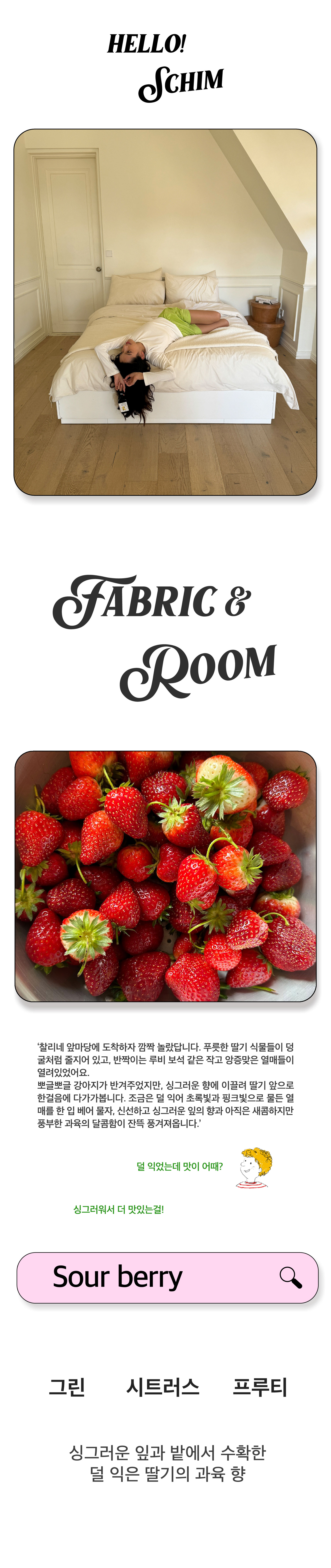 향은 어렵지 않아요! 우연히 스치듯 말이죠. 커다란 지구에서 작은 크기의 우리는, 나만의 것을 찾아가기 위해 자그마한 빛을 내며 살아갑니다. 자신을 표현하기 위한 무궁무진한 것들 중 하나인 '향'은 형용할 수 없지만 어떠한 분위기를 풍겨줍니다. 'SCHIM'은 향에서 스쳐지는 무언가를 독특한 일러스트와 색감을 더하여 구체적으로 표현해나갑니다. 커다란 지구에서 나만의 것을 찾아가는 이 세상의 모든 이들을 위해, 위트있고 재밌게, 그리고 향을 조금 더 가볍고 편하게 다가갈 수 있도록 고유한 제품들을 만들어갑니다. *찰리가 심은 덜 익은 딸기향 |