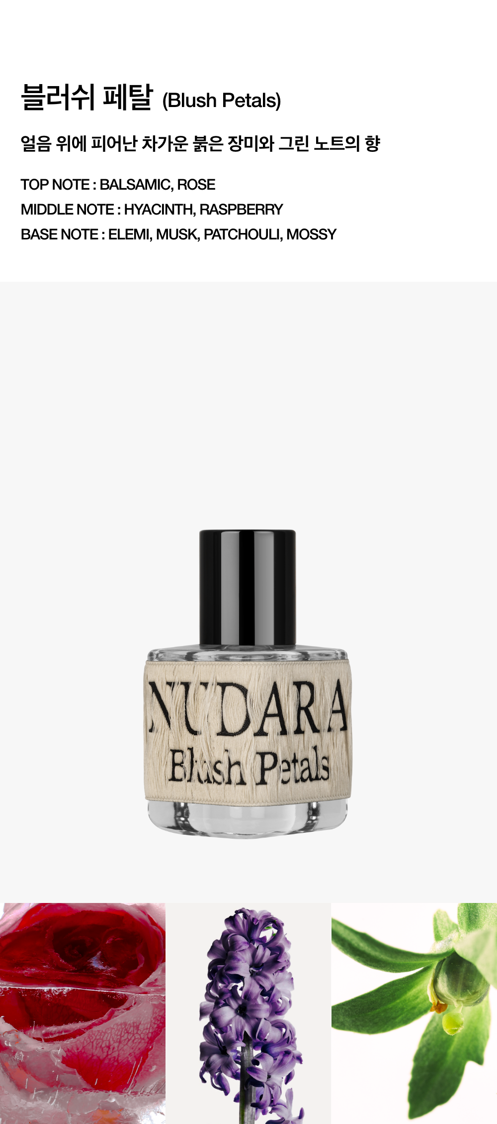 NUDARA는 'Nude'와 'Aroma' 두 단어의 조합으로 탄생한 브랜드입니다. 누다라 시그니처 라인 퍼퓸 3종을 경험해보세요. 매혹적이고 자유로운 감성을 담은 누다라 시그니처 라인은 개개인 본연의 향이 돋보일 수 있도록 파헤쳐 주는 마법과도 같은 역할을 합니다. 새로운 바운더리 속 나만의 세계를 발견해보세요. 고급스러우면서 실키한 패브릭으로 장식된 유리 보틀 디자인은 자신감 넘치는 자신을 표현하는 특별함을 더합니다. 블러쉬 페탈 얼음 위에 피어난 차가운 붉은 장미와 그린 노트의 향 TOP NOTE : BALSAMIC, ROSE MIDDLE NOTE : HYACINTH, RASPBERRY BASE NOTE : ELEMI, MUSK, PATCHOULI, MOSSY |