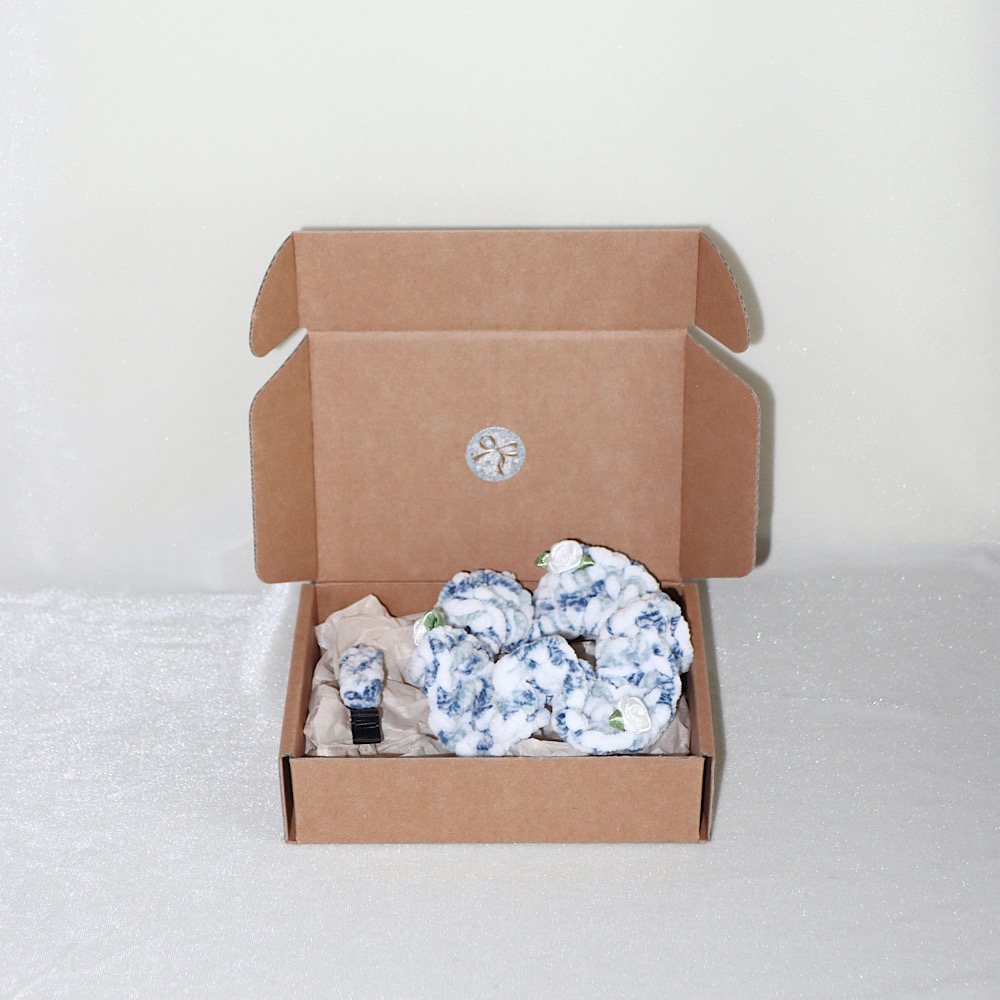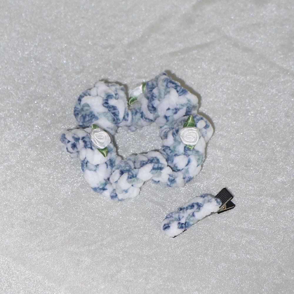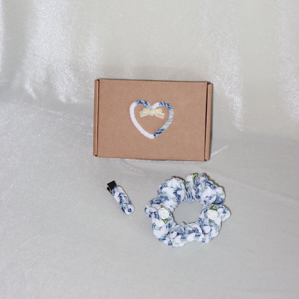 *장미가 장식된 벨벳 재질의 핸드메이드 헤어 스크런치와 핀, 리본과 하트가 장식된