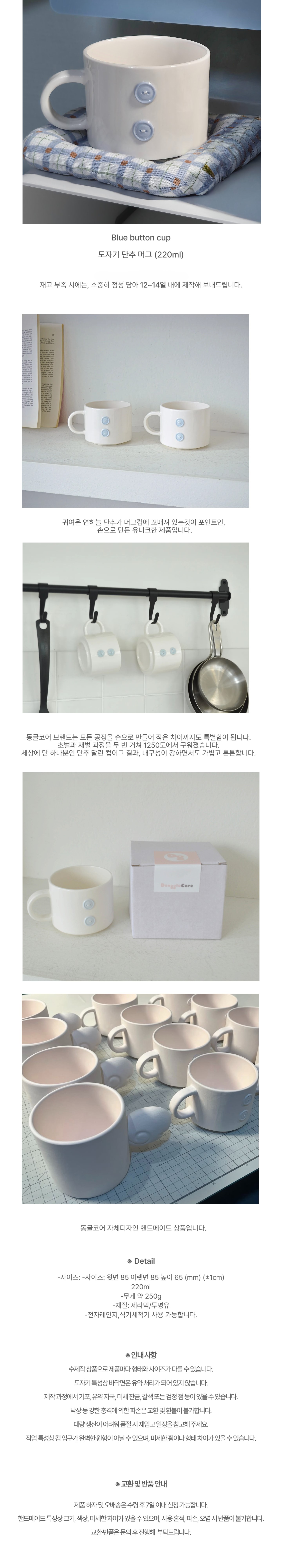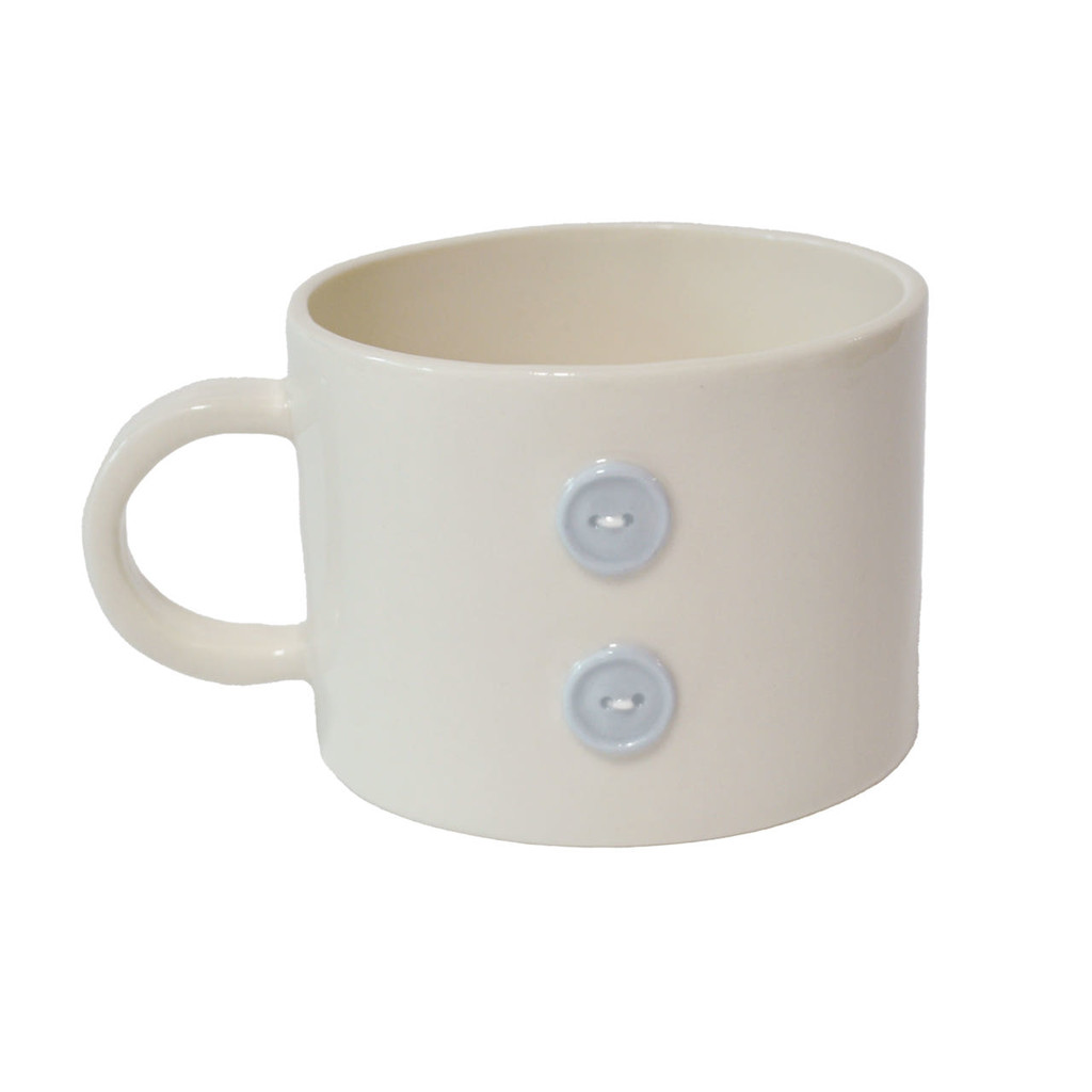 * A mug decorated with a blue button.